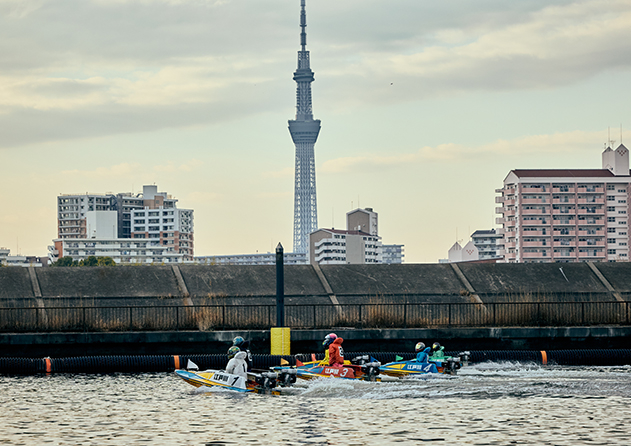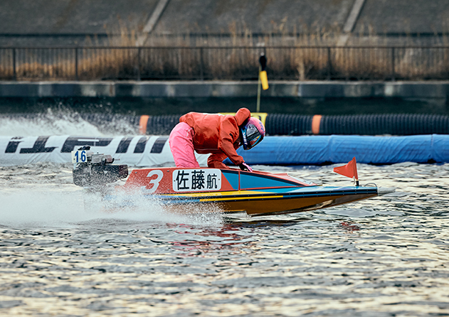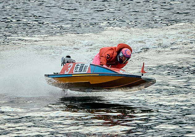 だったが、襲い掛かったのは今年入っての4節で全て優出と最も勢い付く3号艇・佐藤航がツケマイ強襲の一手。コンマ14・3番手のスタートからタイミング良く捲り切り、あっさりと先頭へ抜け出した。馬場は抵抗及ず4番手の位置に後退し、次位優位に運んだのは巧みな小回りで1周1Mを運んだ2号艇・原田。