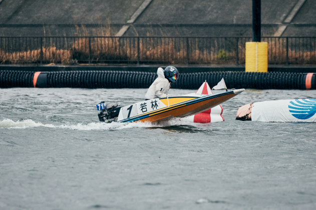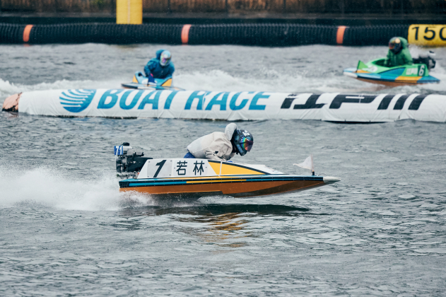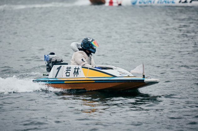 最終日は6Rから安定板装着、8Rからは周回短縮の2周戦。優勝戦は小雨が降る中、上げ潮(約50cm)と向かい風(北・約5m)がぶつかり波高15cmのややポチャつく水面でゴング。カドからコンマ07のトップS、ラストは伸びに寄せる事も示唆していた4号艇・宮田がジワリと覗いて締め込もうとした初手。