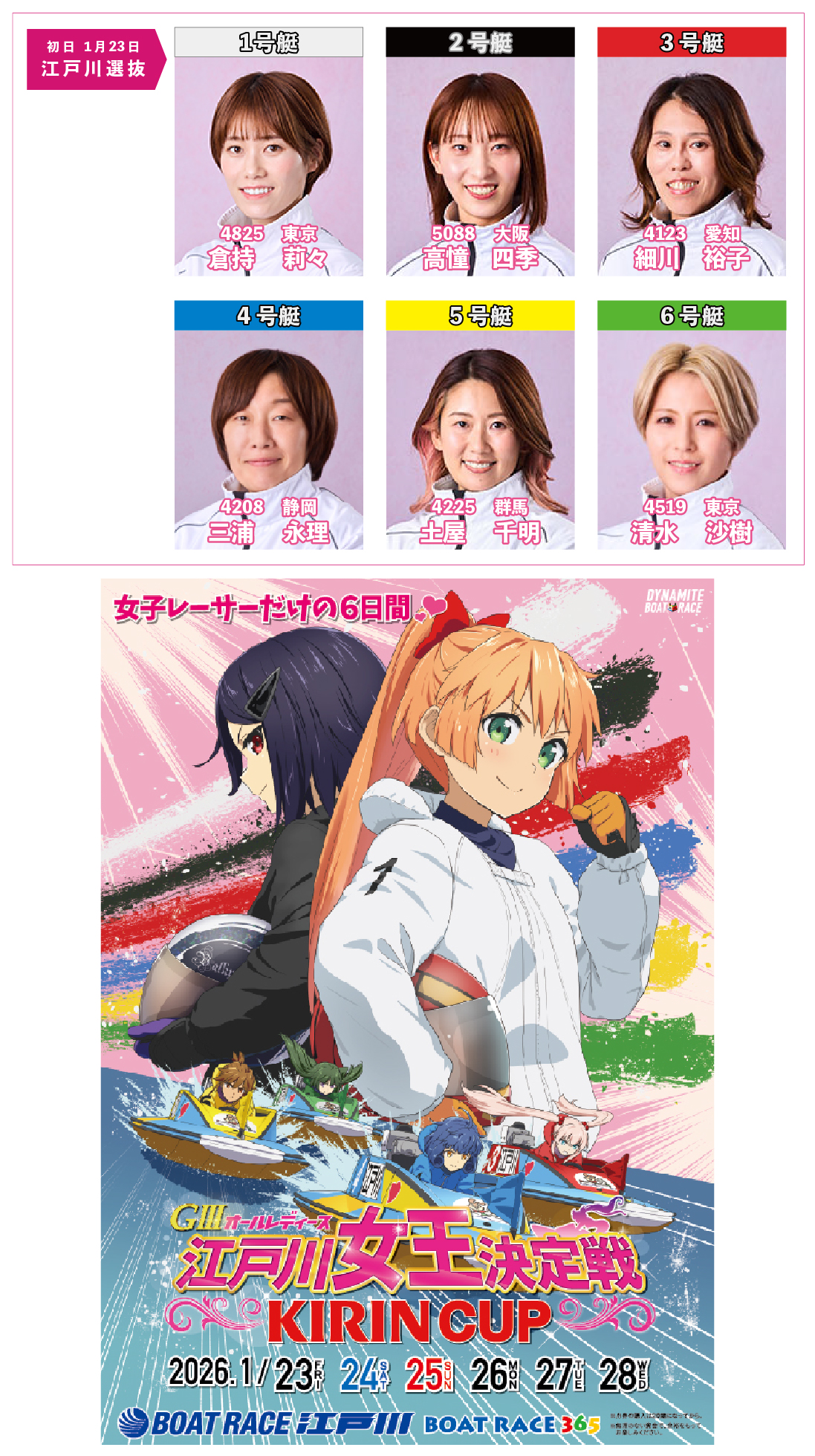 2026年1月23日(金)より6日間シリーズ(2準優制)の「GⅢオールレディース江戸川女王決定戦KIRINCUP」を開催します。 初日メインの【第12R】「江戸川選抜」は、以下の通りです。 ![]() ※上記の出場選手は、予告なく変更となる場合がございます。 |