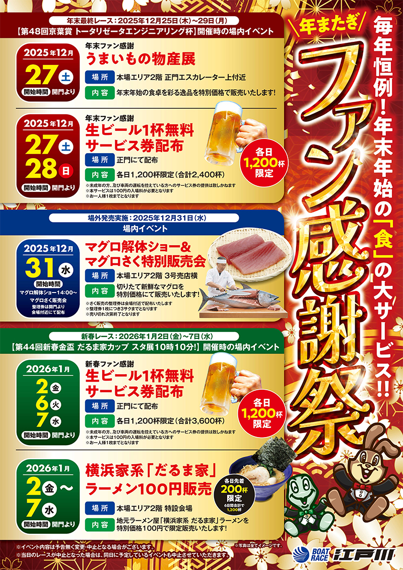 年末年始の本場開催日および場外発売日において、下記の通り「食」のファンサービスを実施いたしますので、皆様のご来場をお待ちしております!