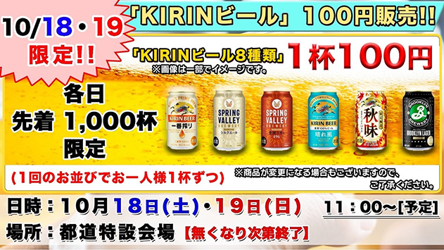 KIRINビール8種を各100円のサービス価格で販売いたします!