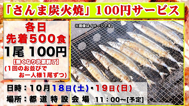 脂ののったさんまを炭火でじっくりと焼き上げて100円のサービス価格で販売いたします!
