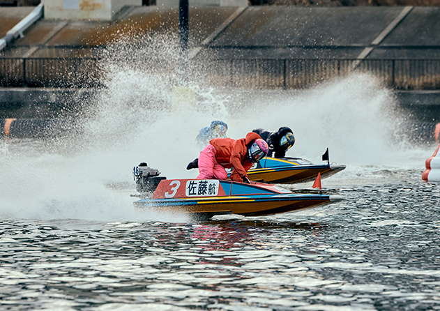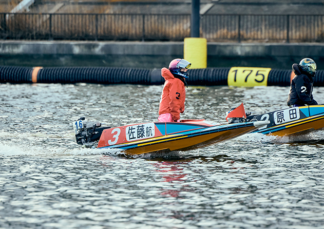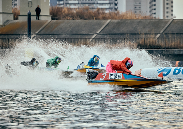 だったが、襲い掛かったのは今年入っての4節で全て優出と最も勢い付く3号艇・佐藤航がツケマイ強襲の一手。コンマ14・3番手のスタートからタイミング良く捲り切り、あっさりと先頭へ抜け出した。馬場は抵抗及ず4番手の位置に後退し、次位優位に運んだのは巧みな小回りで1周1Mを運んだ2号艇・原田。