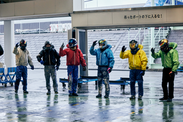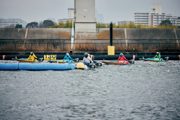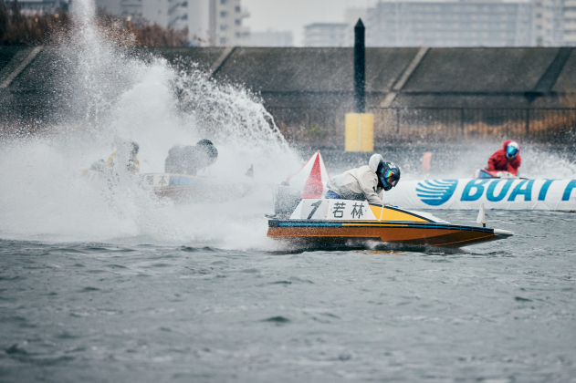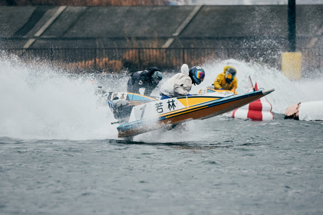 最終日は6Rから安定板装着、8Rからは周回短縮の2周戦。優勝戦は小雨が降る中、上げ潮(約50cm)と向かい風(北・約5m)がぶつかり波高15cmのややポチャつく水面でゴング。カドからコンマ07のトップS、ラストは伸びに寄せる事も示唆していた4号艇・宮田がジワリと覗いて締め込もうとした初手。