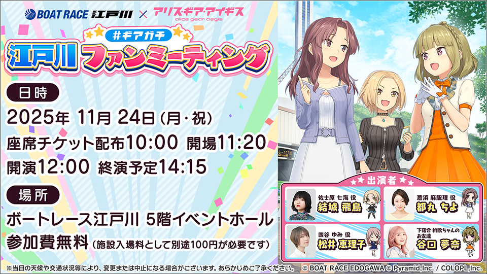 ![]() 【日程】 11月24日(月・祝) 【時間】 座席チケット配布 10:00~(無くなり次第終了) 開場 11:20 開演 12:00(終演予定14:15頃) 【場所】 座席チケット配布場所 本場エリア1階(レストラン笑和前スペース) イベント会場 本場エリア5階 Eホール(イベントホール) 【内容】 「ボートレース江戸川」×「アリス・ギア・アイギス」のコラボYouTube番組『ギア全開★ガチ予想ch(以下、ギアガチch)』初となるリアルイベント『#ギアガチ 江戸川ファンミーティング』を開催致します! 4名の人気声優が出演し、トークセッションやアフレコ朗読劇、豪華賞品が当たる抽選会など内容盛りだくさんでお届けします。 また、ここでしか入手できないスペシャルファンブック、ゲーム内衣装など豪華特典を来場者限定でプレゼント! 最新情報は『ギアガチch』や公式Xにて順次発表しますのでどうぞお見逃しなく! 【注意事項】 ※イベント参加費は無料ですが、ボートレース江戸川入場料100円は必要となります。 ※20歳未満の方だけでは入場できません。必ず保護者同伴でご来場ください。 ※当日の状況等により、イベント内容の変更や中止となる場合がございますので予めご了承ください。 ※本イベントではギアガチchでも配信予定です。 ※座席チケットは、先着順で1名につき1枚お渡し致します。座席チケットを入手できなかった場合でも立見席でイベント参加可能です。 ※終演後は、会場から全員一度ご退出いただきますが、ステージセット完了次第、同一場所で通常のギアガチ公開配信を実施致しますので再度ご入場いただけます。 ※公演中のステージ撮影および録音は、禁止とさせていただきます。 ※会場内では、主催会社や取材メディアによる写真や動画撮影が行われ、ご来場のお客様の様子が映りこむ場合がございます。収録された映像・写真はギアガチchでのYouTube配信、記録用動画・ダイジェスト動画等に使用される可能性がございますので、予めご了承下さい。 ※会場内で係員の指示及び注意に従わない場合、入場をお断りしたり、ご退場頂く場合がございます。 |
